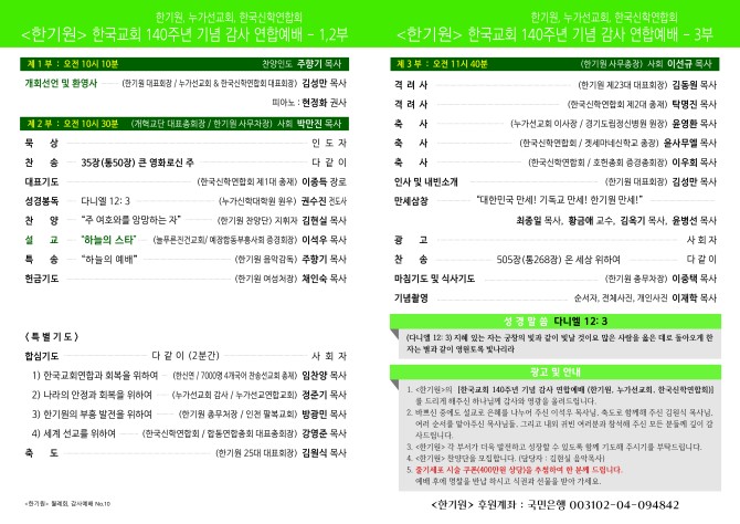 ‘2025년 한국교회 140주년 기념 감사 연합예배 페이지 정보 작성자 관리자 댓글 0건 조회 92회 작성일 25-11-29 06:48 목록 본문 사단법인 누가선교회, 한국기독교원로목사회(한기원), 한국신학연합회가 ‘2025년 한국교회 140주년 기념 감사 연합예배’에서 평생 한국교회 부흥을 위해 수고한 원로목사들의 노고를 위로하고, 남은 생애도 영혼구원에 앞장서는 원로목사와 선교사, 사역자들이 될 것을 결단했다. 댓글 0 댓글목록 등록된 댓글이 없습니다.