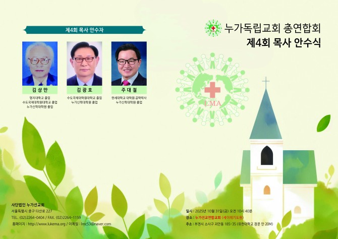 누가선교회 목사 안수식 성황리 거행 페이지 정보 작성자 관리자 댓글 0건 조회 128회 작성일 25-11-15 00:09 목록 본문 누가독립교회총연합회 제4회 목사 안수식 성황리 거행누가독립교회총연합회(총회장 김성만 목사)가 지난달 31일 누가선교연합교회서 제4회 목사 안수식을 하나님의 크신 은혜 가운데 거행했다.이날 누가독립교회총연합회는 누가신학대학원을 졸업한 김상만 목사, 김광호 목사, 주대철 목사 등 3명의 신임 목사를 배출했다. 댓글 0 댓글목록 등록된 댓글이 없습니다.